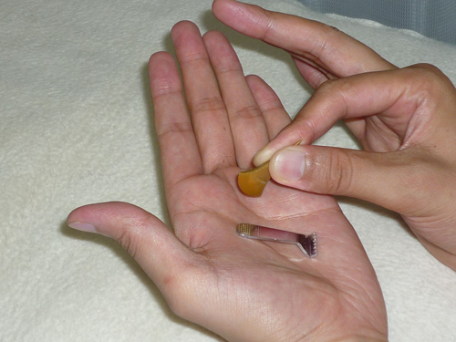 使用する鍼はヘラ状のもので、皮膚をなでるように動かすもので、刺すものではありません。当院では小さいお子様の場合、怖がらないようにお母さんの手に施術して見せてから、だっこされた状態で施術しています。はじめは3~5日続けて行います。
